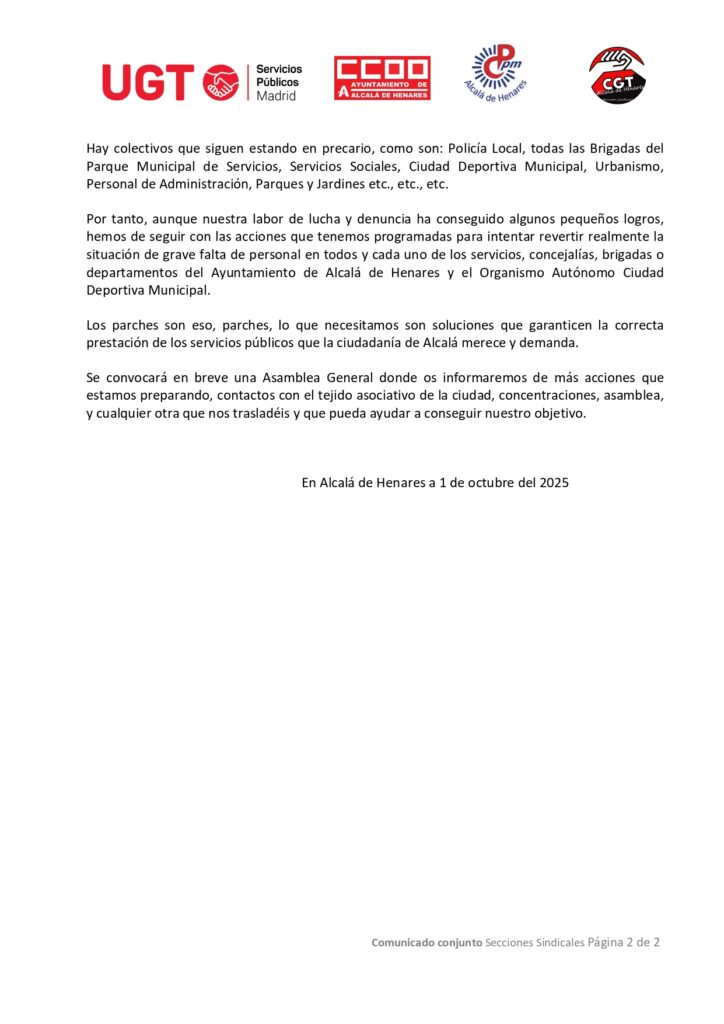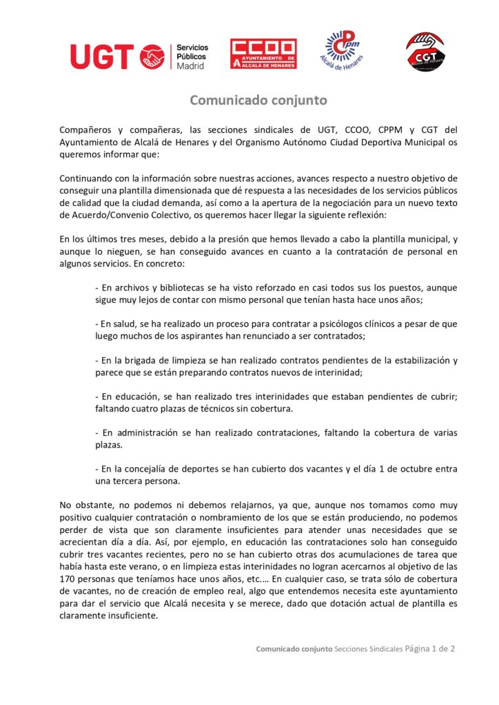 Compañeros y compañeras, en el marco de la convocatoria Confederal de una jornada de lucha para exigir el fin del genocidio y mostrar nuestra solidaridad con el pueblo palestino, os animamos a realizar las dos horas de huelga por turno, y os trasladamos que desde CCOO Henares nos convocan a participar en las concentraciones del próximo … >>Entérate de todo<<