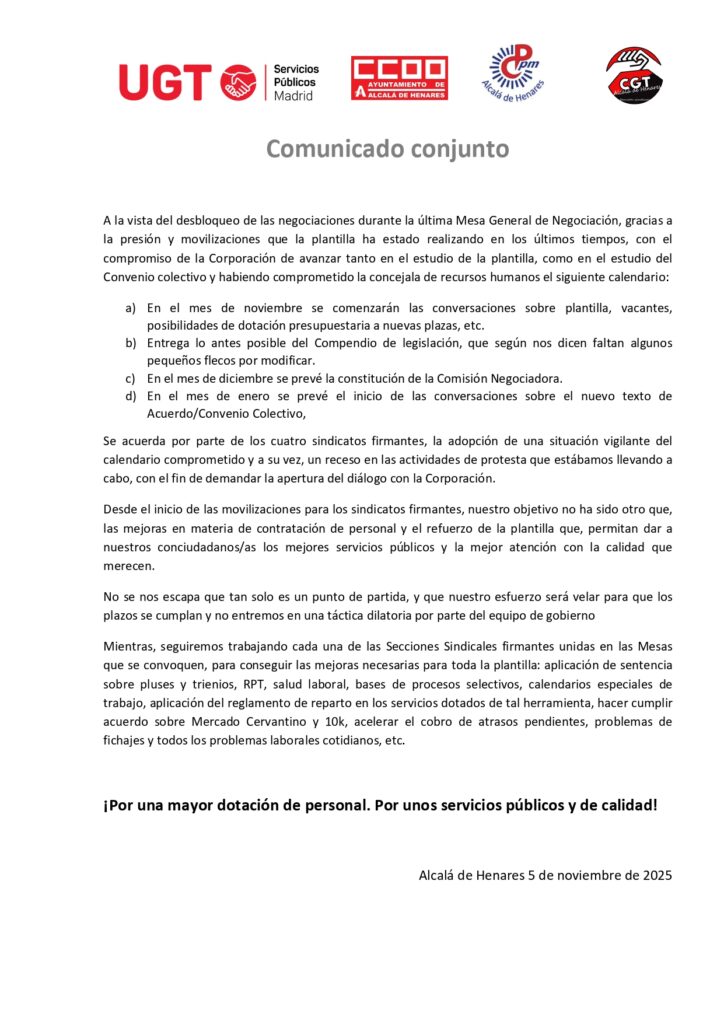 Compañeras y compañeros, os dejamos aquí el comunicado conjunto que hemos consensuado CCOO, UGT, CPPM y CGT.
