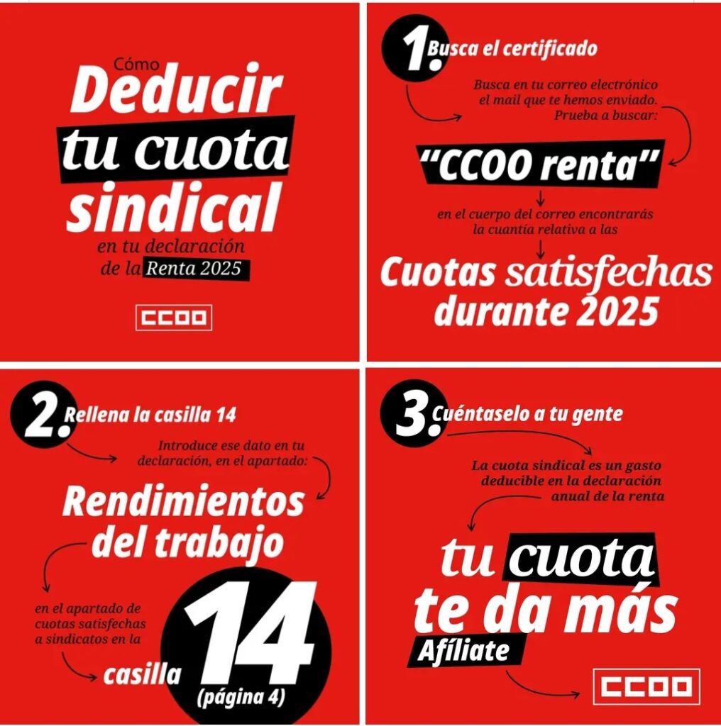 La cuota de afiliación a CCOO es deducible en la declaración de la Renta.